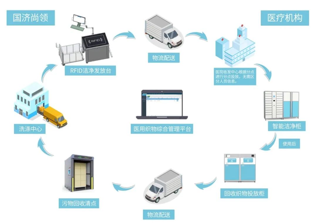 在國濟尚領,每件醫用織物都有自己專屬的“身份證”——獨立的芯片系統。作為醫療機構院感防控的重要環節物品,從醫院開始裝車到最后洗滌干凈送回醫院,中間任何過程都可隨時查看。